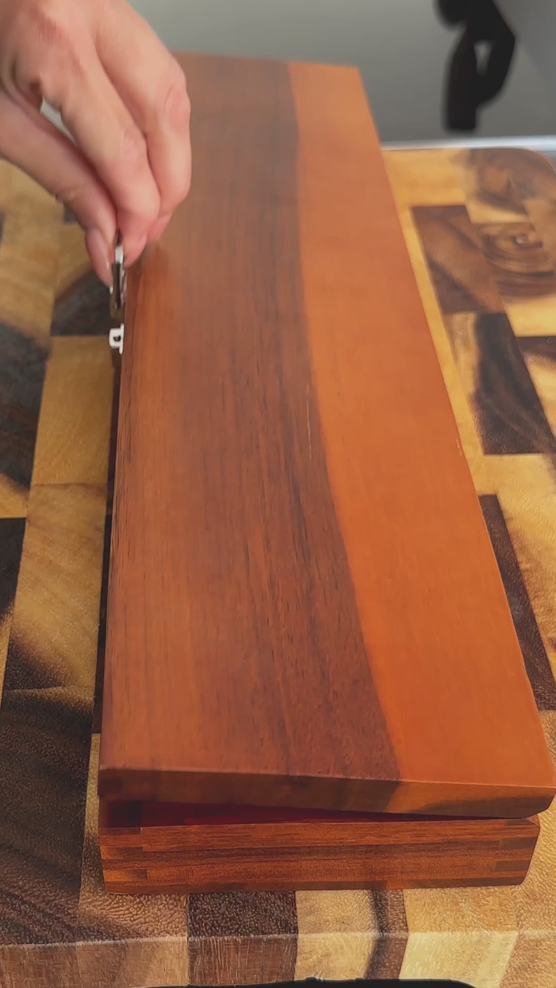 Дърво или пластмаса пазят острието. Избягвай твърди повърхности (стъкло, керамика, камък), които бързо го затъпяват.